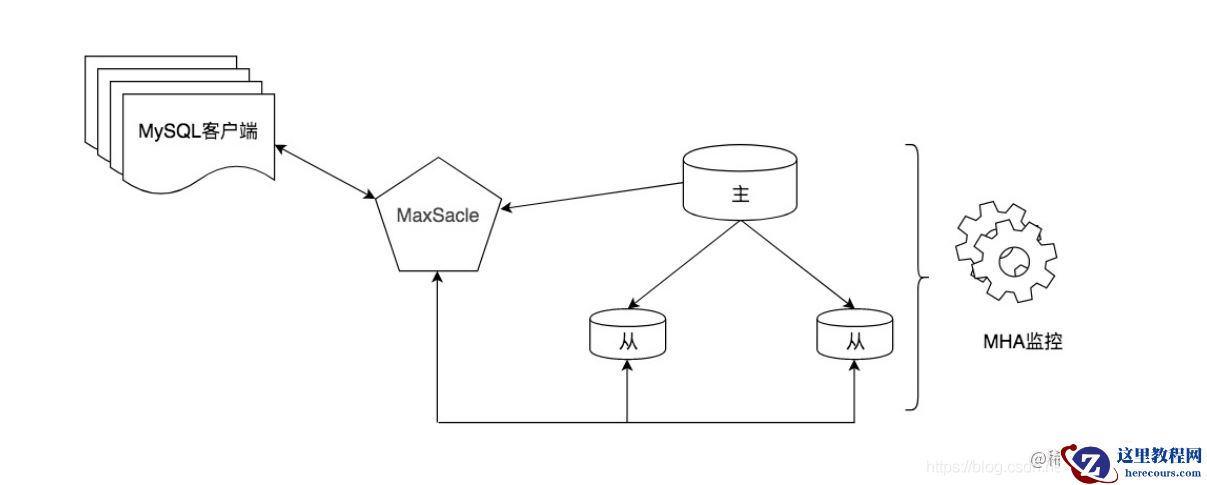 而采用中间件的方法有很明显的优势,功能强大,使用简单。但因为在客户端和数据库之间增加了中间件层会有一些性能损耗,同时商业中间件价格较高,有一定学习成本。另外,我们也可以考虑采用一些优秀的开源工具,比如 MaxScale。它是 MariaDB 开发的 MySQL 数据中间件。比如在下图中,使用 MaxScale作为数据库的代理,通过路由转发完成了读写分离。同时我们也可以使用 MHA 工具作为强一致的主从切换工具,从而完成 MySQL的高可用架构。