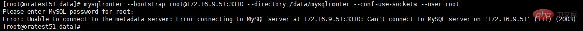 [root@oratest51 data]# mysqlrouter --bootstrap root@172.16.9.51:3310 --directory /data/mysqlrouter --conf-use-sockets --user=root Please enter MySQL password for root: Error: Unable to connect to the metadata server: Error connecting to MySQL server at 172.16.9.51:3310: Can't connect to MySQL server on '172.16.9.51' (111) (2003)