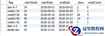 select flag,min(wid) wid,min(startDate) startDate,max(endDate) endDate,count(*) days,0 weekCount