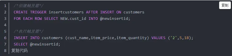 针对INSERT触发器,可以使用虚拟表NEW,来使用刚插入的行数据。比如例子中,SELECT NEW.cust_id INTO @newinsertid表示将新插入的行数据的id赋值给变量@newinsertid;