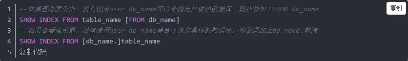 在MySQL中,要查看某个数据库表中的索引也非常简单,只需要使用以下两个命令中的任意一种即可。