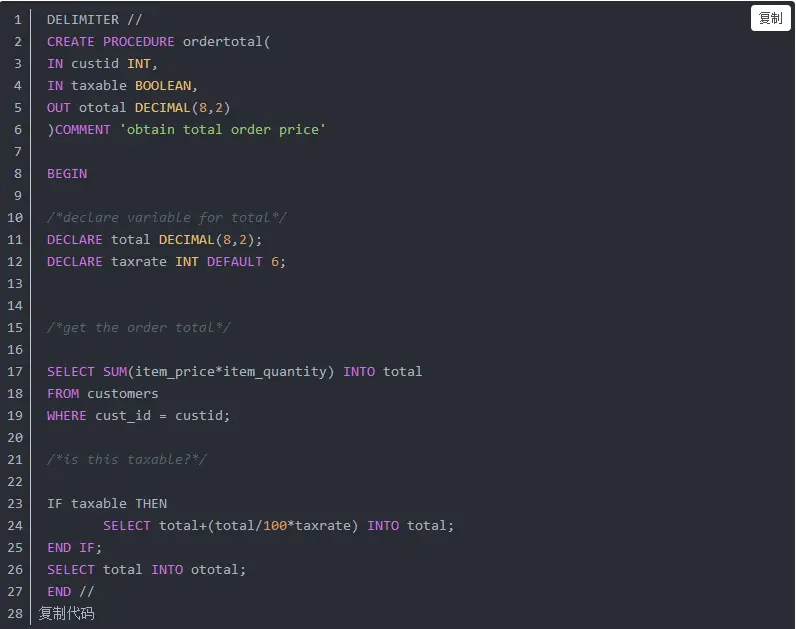 有这样一些细节: 1. 使用CREATE PROCEDURE语句进行创建,()圆括号中为存储过程的参数,其中参数类型有:1. IN 类型,表示传递给存储过程;2. OUT 类型,表示存储过程返回的结果,在调用存储过程时需要传入@开始的变量;3. INOUT 类型,表示在存储过程中可以传入和传出; 2. DECLARE 用来声明一个变量,如这里的total,taxrate。注意MySQL中定义变量时都是变量名在前,数据类型在后。 3. 存储过程具体逻辑写在 BEGIN END 之间; 4. 将值赋给变量使用 INTO 关键字; 5. 由于存储过程中每个SQL语句中用;作为分隔符,会和单个SQL造成冲突,因此可使用 DELIMITER 重新定义分类符,如该例子中定义//为分隔符,自然存储过程结尾就用END //结尾,而不再是END。同时,分隔符//成对出现后,恢复到默认的";"作为分隔符;
