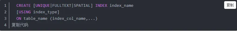 其中括号中的这三个关键字表示创建的索引类型,它们分别表示 唯一索引 、 全文索引 、 空间索引 三种不同的索引类型。如果我们不指定任何关键字,则默认为普通索引。