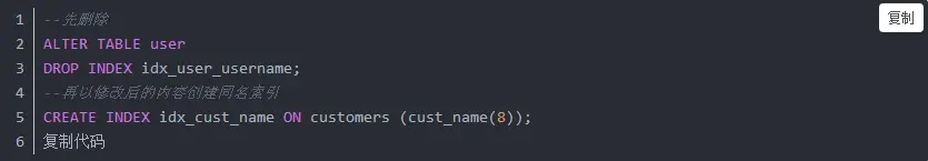 在MySQL中并没有提供修改索引的直接指令,一般情况下,我们需要先删除掉原索引,再根据需要创建一个同名的索引,从而变相地实现修改索引操作。
