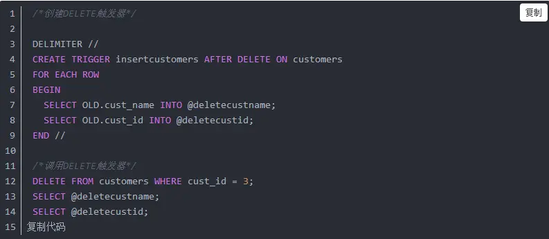 在DELETE触发器代码内,可以引用一个名为OLD的虚拟表,来访问被删除的行;