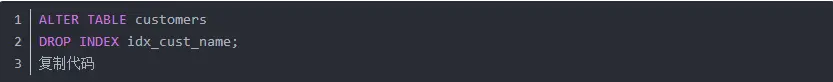 例如删除名称为idx_cust_name的索引,其SQL语句为: