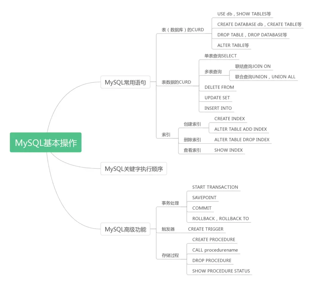 MySQL的基本操作可以包括两个方面:MySQL常用语句如高频率使用的增删改查(CRUD)语句和MySQL高级功能,如存储过程,触发器,事务处理等。而这两个方面又可以细分如下: