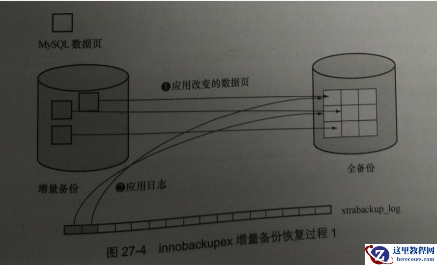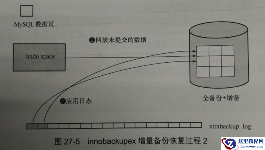 增量恢复:和全备恢复类似,也需要两步,一部分数据文件的恢复,这里数据文件包括全备份、增量备份和xtrabackup_log文件中已提交事务的回放,第二部分是对未提交事务的回滚。