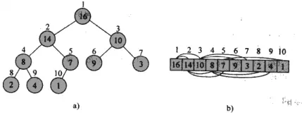 最后我还是想简单描述一下堆排序算法,也当复习一下。具体可以参考算法导论等书籍,我们以大顶堆为例,实际上任何一个待排序的数组都可以看成一棵完全二叉树,用算法导论的截图如下: