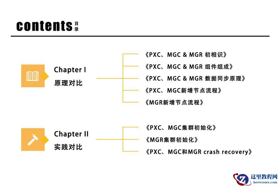 该课程主要内容是关于MySQL目前主流的数据库集群解决方案PXC、MGC、MGR相关原理及实践对比。课程分为两大章节,共8个课时。课程由浅入深,依次为大家介绍不同集群架构实现组件及组件的作用、数据同步原理的异同点、新增节点的流程、初始化步骤以及crash之后recover步骤。