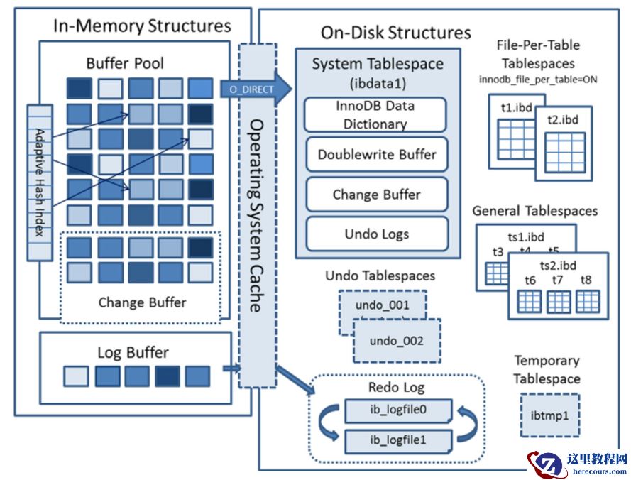 Change Buffer写缓存:主要读Buffer Pool里面的数据页,对数据页进行修改操作(insert,delete,update)。数据修改时会写入Log Buffer日志。