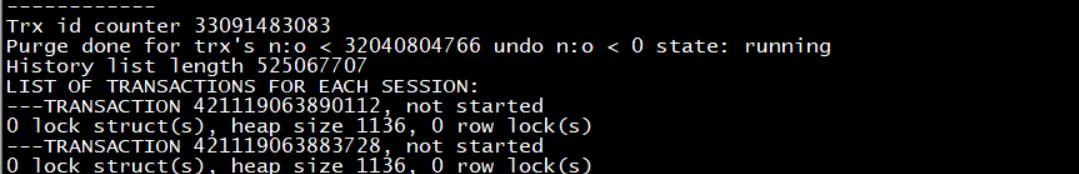 ------------ TRANSACTIONS ------------ Trx id counter 33083158036 Purge done for trx's n:o < 31961212290 undo n:o < 0 state: running History list length 560689581 作者微信:**gp_22389860**