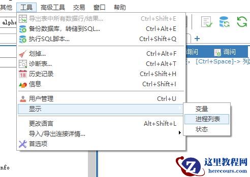 如果你使用的 SQLyog,那么也有图形化的页面,在菜单栏→工具→显示→进程列表。