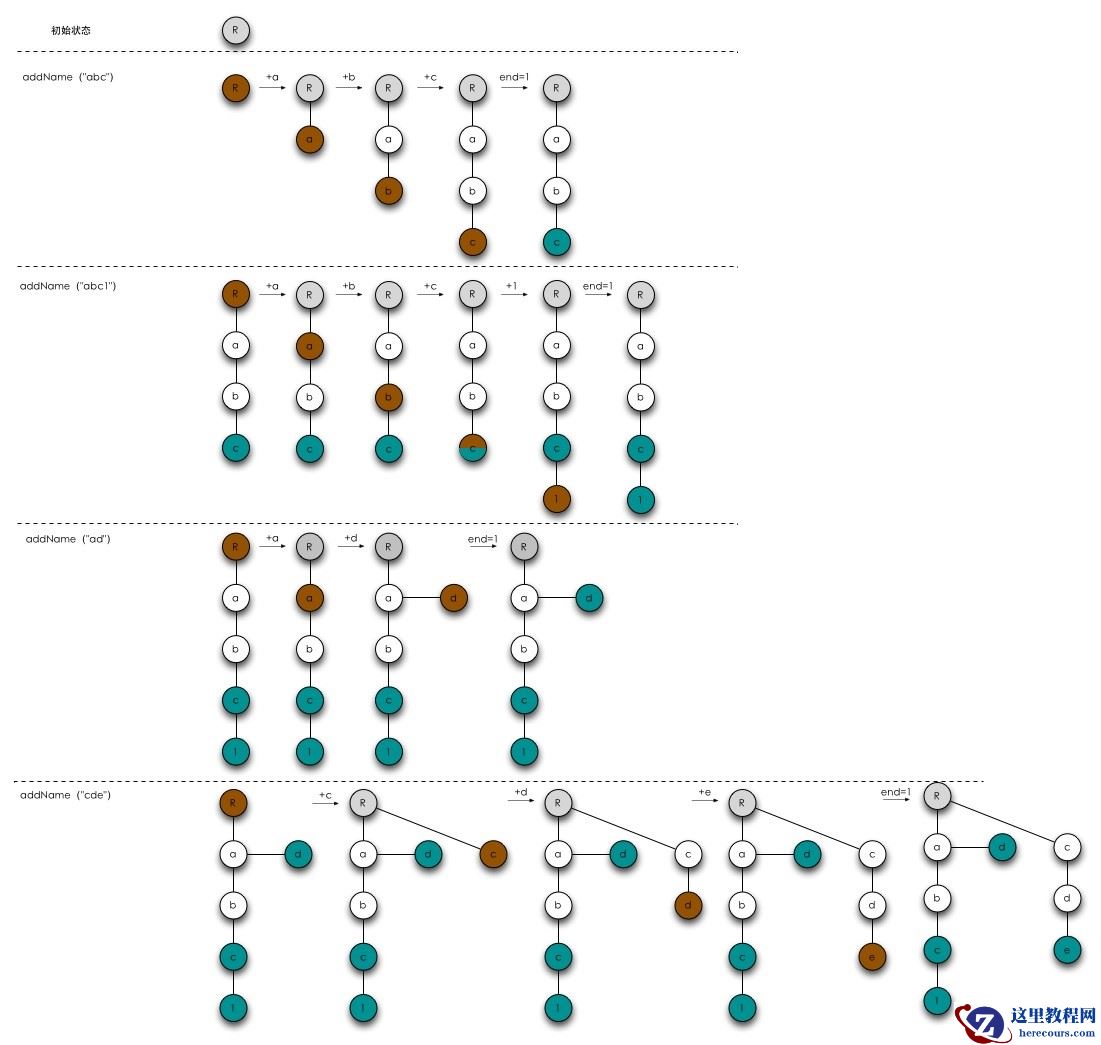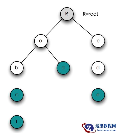 图1中,R表示根节点,青色节点我们称为结束节点,从R到每个结束节点的路径都表示一个文件名。可以在树中查找是否含有某个文件名、遍历树中所有的文件名、对树序列化进行保存、由序列化结果反序列化重新生成树。