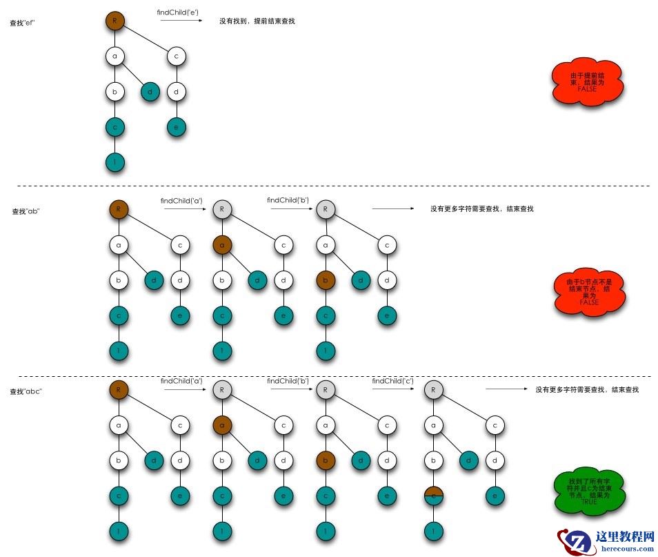 查找树中是否含有一个某个文件名,对应Tree的contain方法。在图2中的结果上分别查找ef、ab和abc三个文件来演示查找的过程。如图3所示。