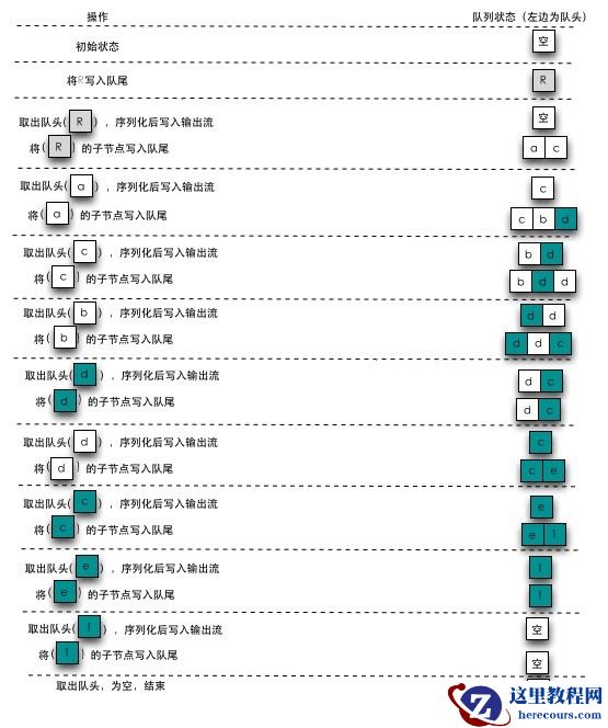 对树进行广度遍历,在遍历过程中需要借助队列,以图4的序列化为例进行说明: