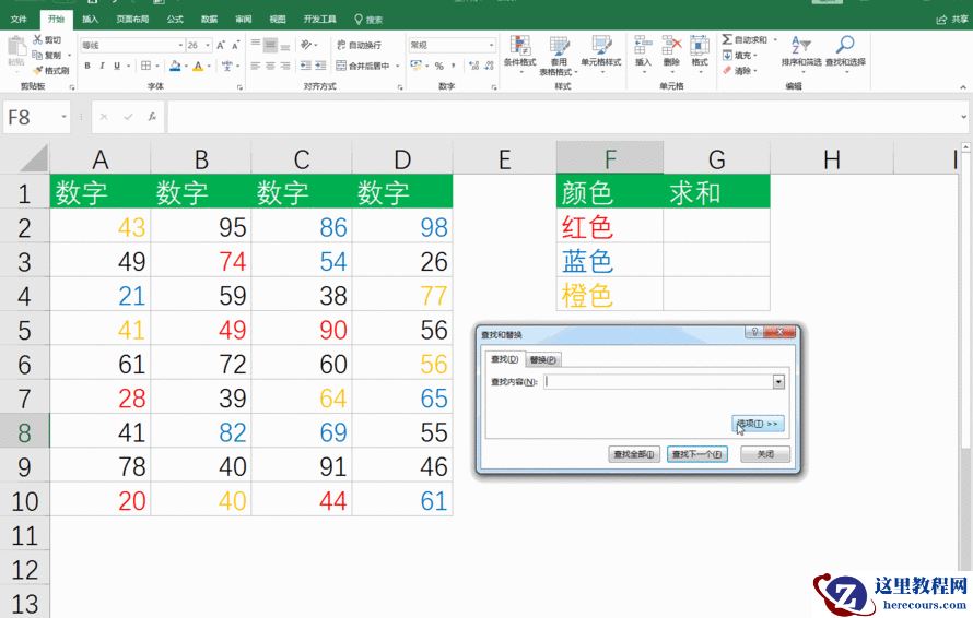 如下图,需要在G列按指定颜色对A,B,C,D列的数字求和。