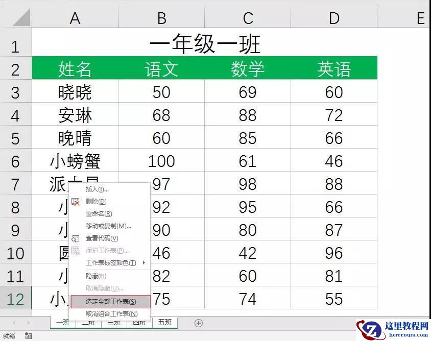 首先在任意工作表下方右键点击【选定全部工作表】将excel工作簿里的所有工作表全部选中。