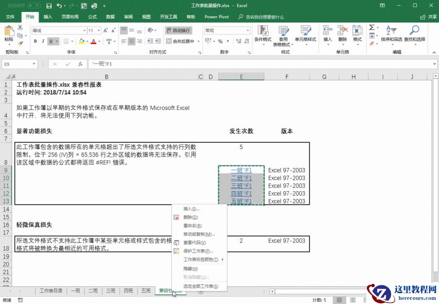 在兼容性报表里面我们可以看到只要超出了2003版本中没有的功能就会检查出来,并显示工作表名称。