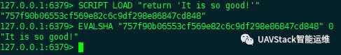 Redis提供了一个SCRIPTLOAD命令,命令后面的script即为Lua脚本。命令将脚本script添加到脚本缓存中,但并不立即执行这个脚本。执行命令后,Redis会返回一个SHA1串,第二个EVALSHA命令即可执行。