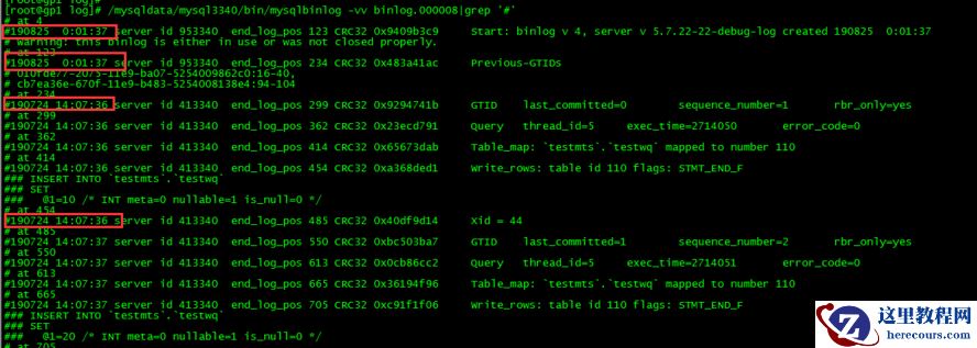 [root@node3 binlog]# vim a.txt # 发现binlog中event的时间戳乱序了,内容如下(FDE、Previous-GTIDs的时间戳为190729 17:22:00,记录数据的GTID、Query、Table_map、Update_rows|Delete_rows|Update_rows、Xid时间戳在190729 17:19:18 ~ 190729 17:20:57之间,Rotate时间戳为190729 17:20:57) #190729 17:22:00 server id 33062 end_log_pos 123 CRC32 0xc3a9ea93 Start: binlog v 4, server v 5.7.27-log created 190729 17:22:00 #190729 17:22:00 server id 33062 end_log_pos 194 CRC32 0x22797305 Previous-GTIDs #190729 17:19:18 server id 33061 end_log_pos 259 CRC32 0xd48537a6 GTID last_committed=0 sequence_number=1 rbr_only=yes SET @@SESSION.GTID_NEXT= 'd9c5c228-b1e0-11e9-b14d-525400c33752:258161'/*!*/; #190729 17:19:18 server id 33061 end_log_pos 327 CRC32 0x78818eeb Query thread_id=364 exec_time=650 error_code=0 #190729 17:19:18 server id 33061 end_log_pos 451 CRC32 0x6ca05182 Table_map: `sbtest`.`sbtest1` mapped to number 115 #190729 17:19:18 server id 33061 end_log_pos 867 CRC32 0xce1dc10f Update_rows: table id 115 flags: STMT_END_F #190729 17:19:18 server id 33061 end_log_pos 986 CRC32 0xf4d017ed Table_map: `sbtest`.`sbtest2` mapped to number 114 #190729 17:19:18 server id 33061 end_log_pos 1211 CRC32 0xbbaebd66 Delete_rows: table id 114 flags: STMT_END_F #190729 17:19:18 server id 33061 end_log_pos 1541 CRC32 0x14f2e853 Table_map: `sbtest`.`sbtest2` mapped to number 114 #190729 17:19:18 server id 33061 end_log_pos 1766 CRC32 0xd9080627 Write_rows: table id 114 flags: STMT_END_F #190729 17:19:18 server id 33061 end_log_pos 1797 CRC32 0x1d0265e4 Xid = 1084024 ...... #190729 17:20:57 server id 33061 end_log_pos 536900936 CRC32 0x12796d01 GTID last_committed=260141 sequence_number=260157 rbr_only=yes SET @@SESSION.GTID_NEXT= 'd9c5c228-b1e0-11e9-b14d-525400c33752:518317'/*!*/; #190729 17:20:57 server id 33061 end_log_pos 536901004 CRC32 0x8eb6df8a Query thread_id=360 exec_time=622 error_code=0 #190729 17:20:57 server id 33061 end_log_pos 536901128 CRC32 0x3e09a82e Table_map: `sbtest`.`sbtest2` mapped to number 114 #190729 17:20:57 server id 33061 end_log_pos 536901544 CRC32 0xa97d84de Update_rows: table id 114 flags: STMT_END_F #190729 17:20:57 server id 33061 end_log_pos 536901786 CRC32 0x35aec8ff Table_map: `sbtest`.`sbtest1` mapped to number 115 #190729 17:20:57 server id 33061 end_log_pos 536902202 CRC32 0x05064820 Update_rows: table id 115 flags: STMT_END_F #190729 17:20:57 server id 33061 end_log_pos 536902321 CRC32 0x293c82e4 Table_map: `sbtest`.`sbtest1` mapped to number 115 #190729 17:20:57 server id 33061 end_log_pos 536902546 CRC32 0xe4bfcf8b Delete_rows: table id 115 flags: STMT_END_F #190729 17:20:57 server id 33061 end_log_pos 536902876 CRC32 0x1fbc35a7 Table_map: `sbtest`.`sbtest1` mapped to number 115 #190729 17:20:57 server id 33061 end_log_pos 536903101 CRC32 0x45c6cc8e Write_rows: table id 115 flags: STMT_END_F #190729 17:20:57 server id 33061 end_log_pos 536903132 CRC32 0xc6b80fb0 Xid = 2284911 #190729 17:20:57 server id 33062 end_log_pos 536903179 CRC32 0x23a1bcf6 Rotate to mysql-bin.000011 pos: 4