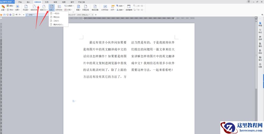 很多时候我们为了使文章看上去美观,会将文章进行分栏,怎样操作呢?点击页面布局按钮—分栏,在弹出的栏目中根据自己的需要进行选择即可;