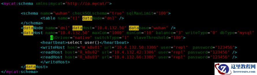 <writeHost host="W_k8s01" url="10.4.132.50:3306" user="repl" password="123456"> --后端主机(用户名和密码是mycat服务器可以登陆后面mysql的权限)