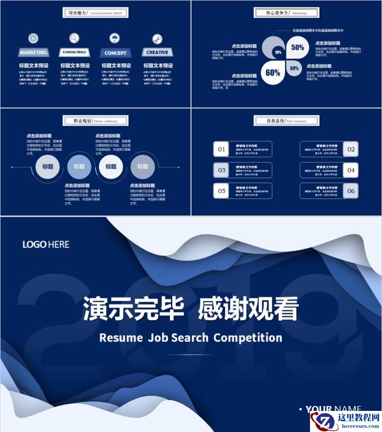 深蓝色经典个人简历求职应聘ppt模板,使用了多层次淡雅设计布局,具有较强的立体感和空间层次,PPT整体视觉效果是严谨且庄重。