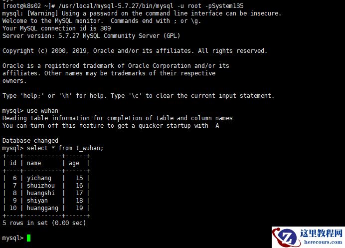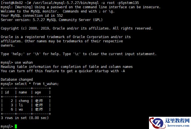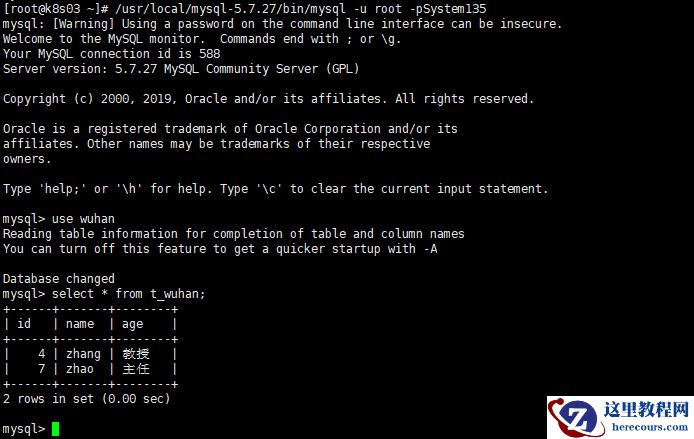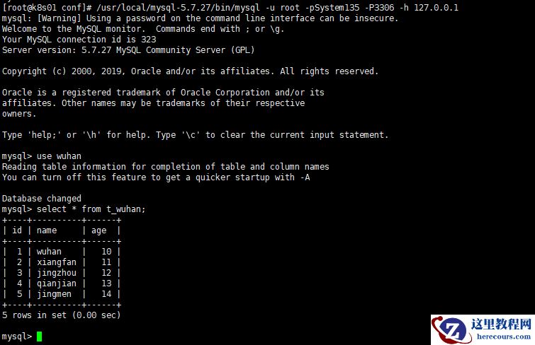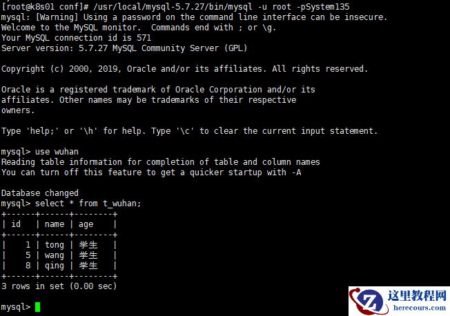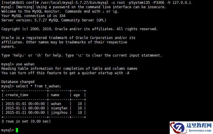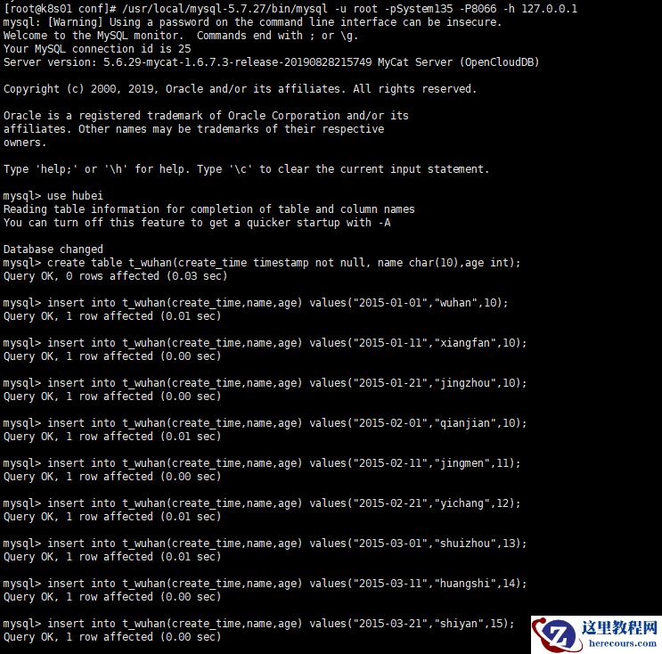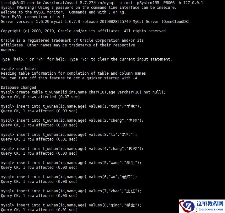 [root@k8s01 conf]# /usr/local/mysql-5.7.27/bin/mysql -u root -pSystem135 -P8066 -h 127.0.0.1 --登陆Mycat数据数据