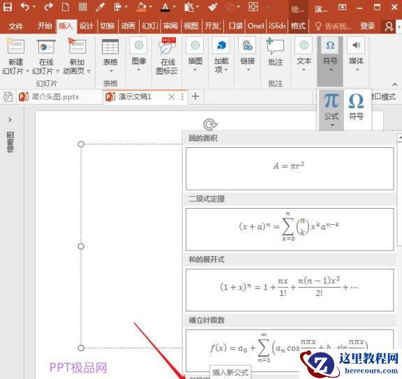 当光标在文本框中闪烁时,单击“插入”选项卡“符号”组中“公式”下的“插入新公式”菜单;