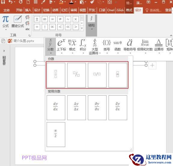 在“设计”页签下,点击“结构”中的“分数”,可以看到有三种内置的分数样式;