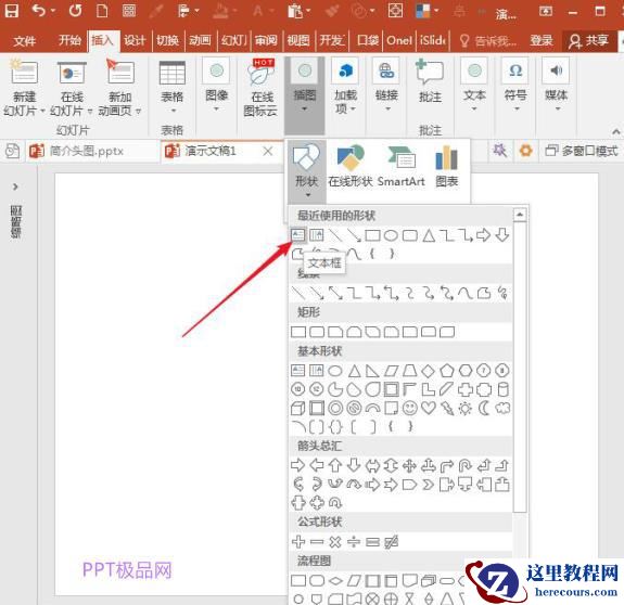 单击“插入”选项卡“插图”组中“形状”下的文本框工具;