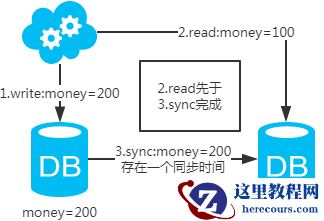 注: 图中圈出的是数据同步的地方,数据同步(从库从主库拉取binlog日志,再执行一遍)是需要时间的,这个同步时间内主库和从库的数据会存在不一致的情况。如果同步过程中有读请求,那么读到的就是从库中的老数据。如下图。