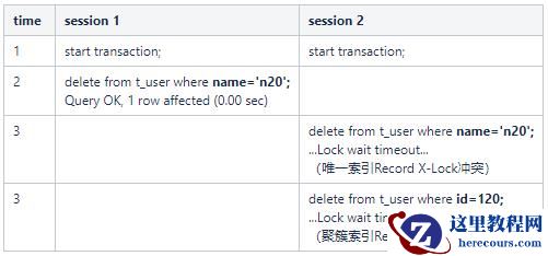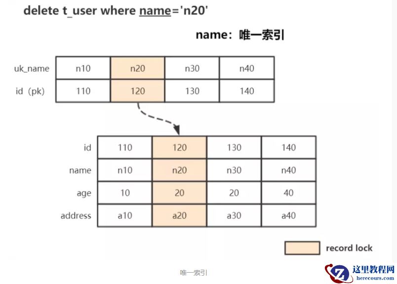 例:delete from t_user where name='n20'; 条件为唯一索引,锁住索引记录,同时锁住聚簇索引中的对应行记录: