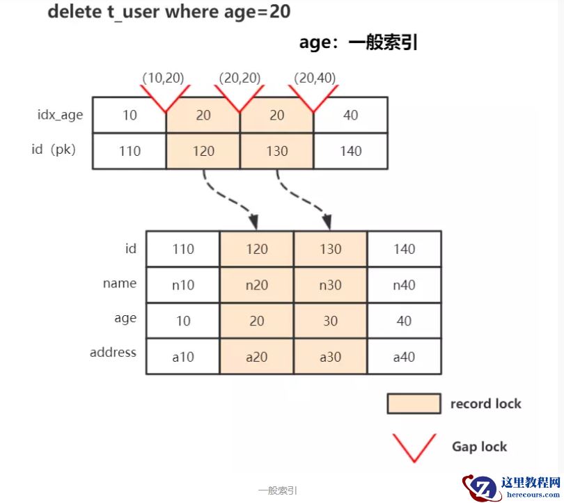 例:delete from t_user where age=20; 与主键和唯一索引不同的是,一般索引的记录是允许重复的;换句话说,如果我们单纯地给索引加记录锁时,其他事务依然可以插入,也就有可能出现幻读问题了。