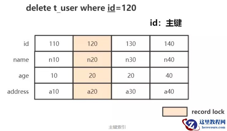 例:delete from t_user where id=120; 条件为主键,此时锁住聚簇索引中对应的行记录:即Record Locks锁住id=120的行记录。