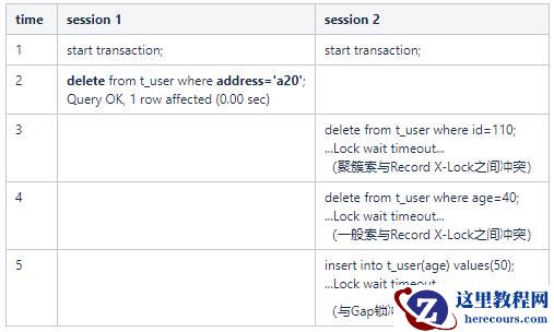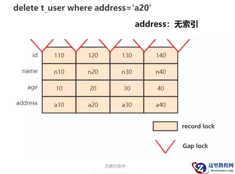 delete from t_user where address='a20',因为无法精准定位,InnoDB选择将聚簇索引中的所有行以及间隙都锁起来,功能上已经等于锁表了:
