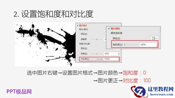 步骤二:选中图片并且设置图片颜色的“饱和度”和图片更正的“对比度”。