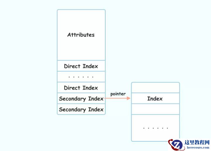 索引可以说是 InnoDB 最重要的数据结构,介绍数据库索引的资料也很多,谈点题外话,什么是索引呢?索引其实就是帮助我们快速查找到数据( data ) 的辅助结构,可以说有数据的地方就需要索引。比如在文件系统里,数据的索引保存在元数据 inode 信息中,它记录着这个文件所有的数据页( data pages ) 具体在哪个位置,比如文件有10个页,它就对应记录10个页框的物理地址。文件系统的索引当然也会有直接索引和间接索引,因为如果直接索引装不下,就会用二级索引来装,其结构如下图所示,