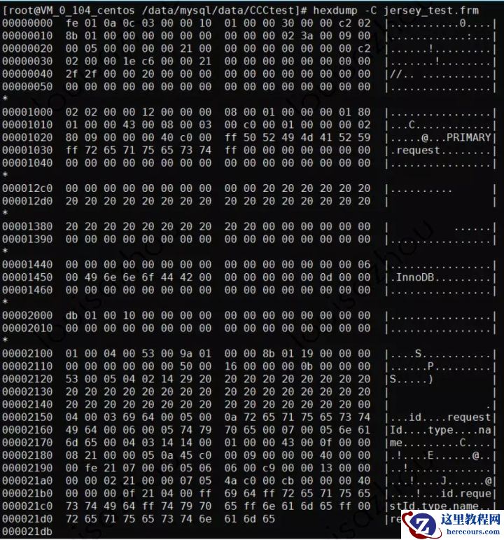 .frm 文件是二进制格式的,我们通过 hexdump 工具稍加分析,可以看到文件中除了一些编码信息外,主要内容就是表结构信息。