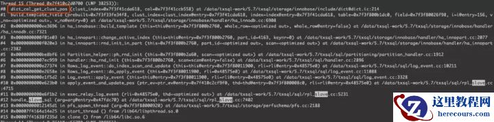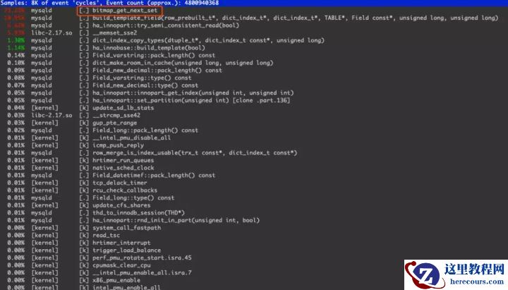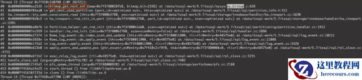 通过pstack抓取堆栈,找到SQL_thread线程对应的thread 15,再结合perf信息,可以看到从机回放慢是卡在了bitmap_get_next_set()。