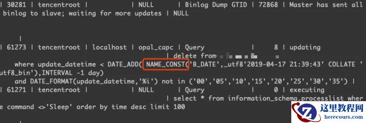 通过show processlist,可以看到这条delete在procedure内部执行的时候,被MySQL自动加上了NAME_CONST函数,所以导致了以ROW模式记录binlog格式。那为什么在procedure中会被改写成这样的SQL呢?怎么样才能让这条SQL记录为statement的格式呢?
