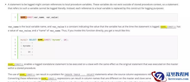 看了MySQL官方在procedure里面的限制描述,MySQL会自动加上NAME_CONST主要是为了从机可以识别到B_DATE这个SP的Local vairable,不至于从机回放的时候报错。