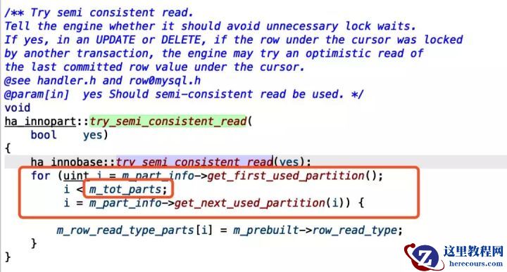 try_semi_consistent_read() 这个函数中出现了可疑的循环,这里会调用m_tot_parts次get_next_used_partition。看了一下定义m_tot_parts是分区表的总分区数!!!