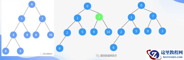 初始堆的情况是这个样子的。大家应该都知道小顶堆,最小的数在最上面,也就是在根节点。MySQL的event执行顺序是怎么样的一个算法呢,每一次都去取这个根节点的event来执行,因为这个event是离我时间最近的那个,然后把它取出来等,等到设定的那个时间去执行。取出来一个,然后再把下面一个最近时间的event放到根节点。那我们看我们在做删除一个元素(也就是drop一个event)的时候会发生一些什么样的情况。比方说要删除第一个图中的7,删除7这个动作就会对应MySQL里的drop event这样一个操作。在做删除7这个节点时,会把最后加进去的元素3 放到7的这个位置上,做一个替换,就变成图二的样子。然后再去做排序,从删的地方开始向下做排序,保证3这个节点一定比它下面的节点都要小。但我们发现有一个问题,比如说删除的不是7这个节点,删除的是10这个节点,会发生一种什么情况呢?把3替换到10的位置,就会成为图三的这种情况,按照它原来的算法,它去调整它的子节点,但是因为3是没有子节点的,它就不调整了,然后堆就会变成图三的情况了。大家是不是可以看到,它已经违反了小顶堆的原则,就是父节点永远比子节点小,因为图三中的3是子节点7是父节点,7比这个3要大所以它就错了。在后续排序的过程中就会出现问题,取下一个节点的时候,就会先取7这个节点而不会取这个3节点。这就造成到了执行的时间点不去执行,反而会去执行另外一个节点。非常隐蔽的一个问题,这个问题我们花了很长时间来跟踪,最终才解决了它。