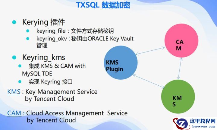 现在,大家越来越注重自己的数据安全了,不管客户数据还是其他数据都不希望被别人拿到。我们的数据加密功能会针对所有的落盘数据,你的ibd文件,只要落盘我们都进行了加密。这个加密是基于官方的TDE(透明数据加密)功能做的。腾讯云的加密基于官方的TDE,集成了腾讯的秘钥管理插件KMS。加密的秘钥是通过KMS Plugin插件来获得的,所以不用担心秘钥被其他人获取。