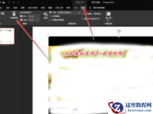 插入视频后,我们选择视频并单击弹出的“播放”选项卡中的剪辑视频;