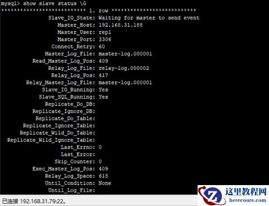mysql> change master to master_host='192.168.31.188',master_user='rep1', master_password='Oracle123',master_port=3306,master_log_file='master-log.000001',master_log_pos=409;