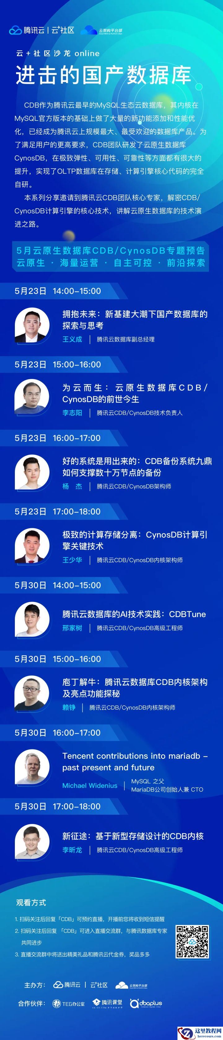 5月23日和5月30日 14:00-18:00,MySQL之父Monty、腾讯云CDB团队核心专家将在线联袂分享,围绕云原生、海量运营、自主可控和前沿探索,解密CDB/CynosDB计算引擎的核心技术,讲解云原生数据库的技术演进之路。