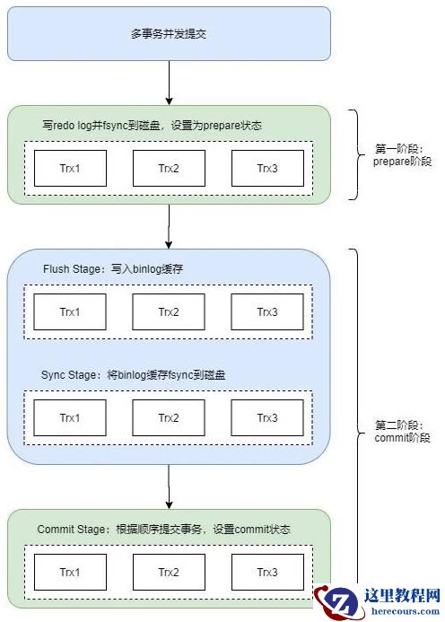 第一阶段(prepare阶段):持有prepare_commit_mutex,并且write/fsync redo log到磁盘,设置为prepared状态,完成后就释放prepare_commit_mutex,binlog不作任何操作。第二个阶段(commit阶段):这里拆分成了三步,每一步的任务分配给一个专门的线程处理:
